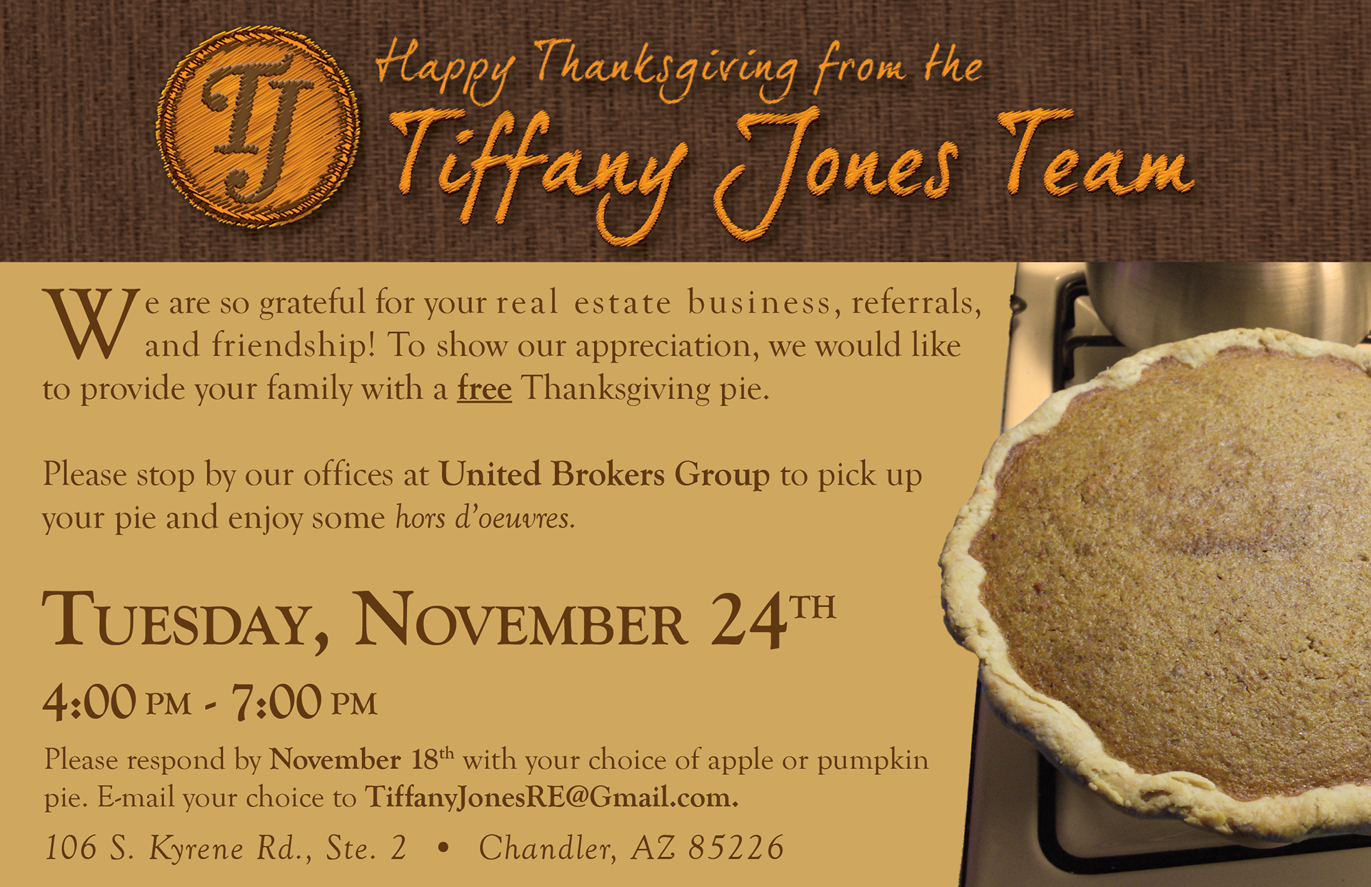 8.5" x 5.5" Thanksgiving-themed postcard mailing for a Phoenix, AZ-based real estate agency.