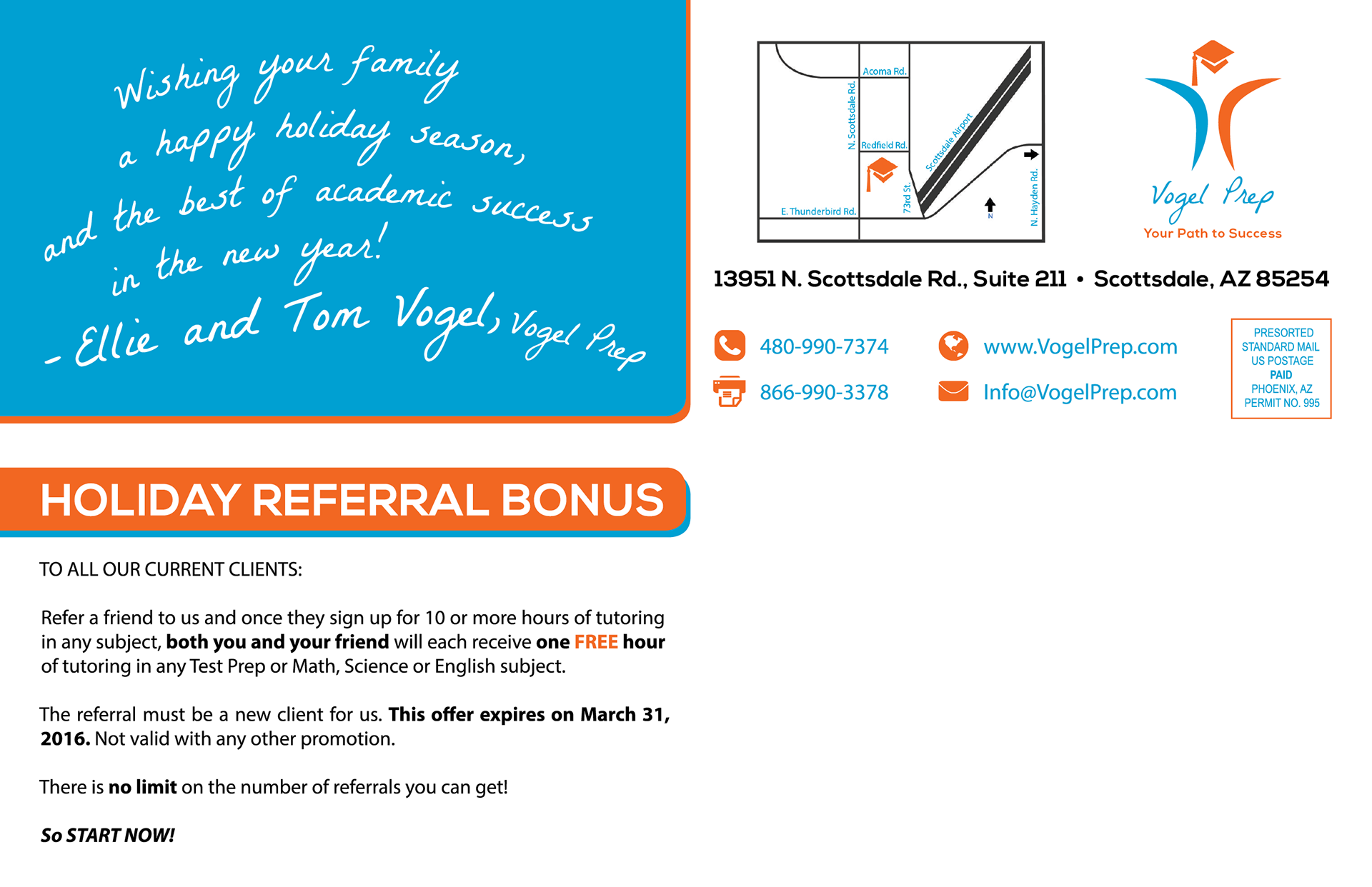 8.5" x 5.5" EDDM postcard for a Scottsdale, AZ-based high school tutoring firm.