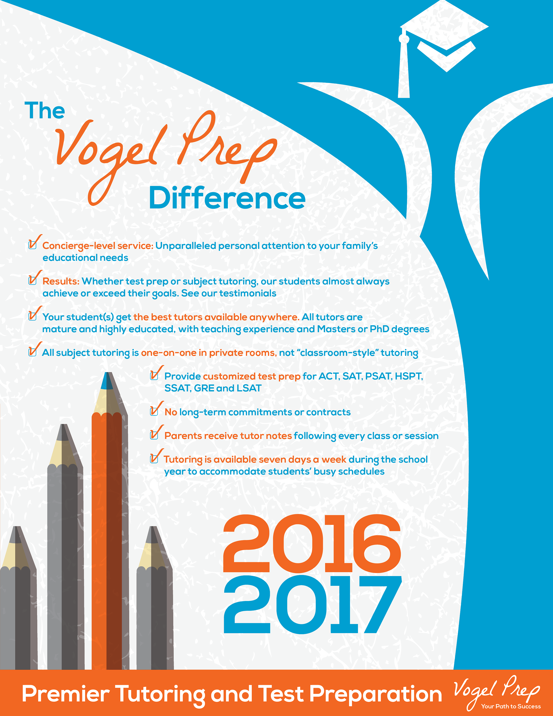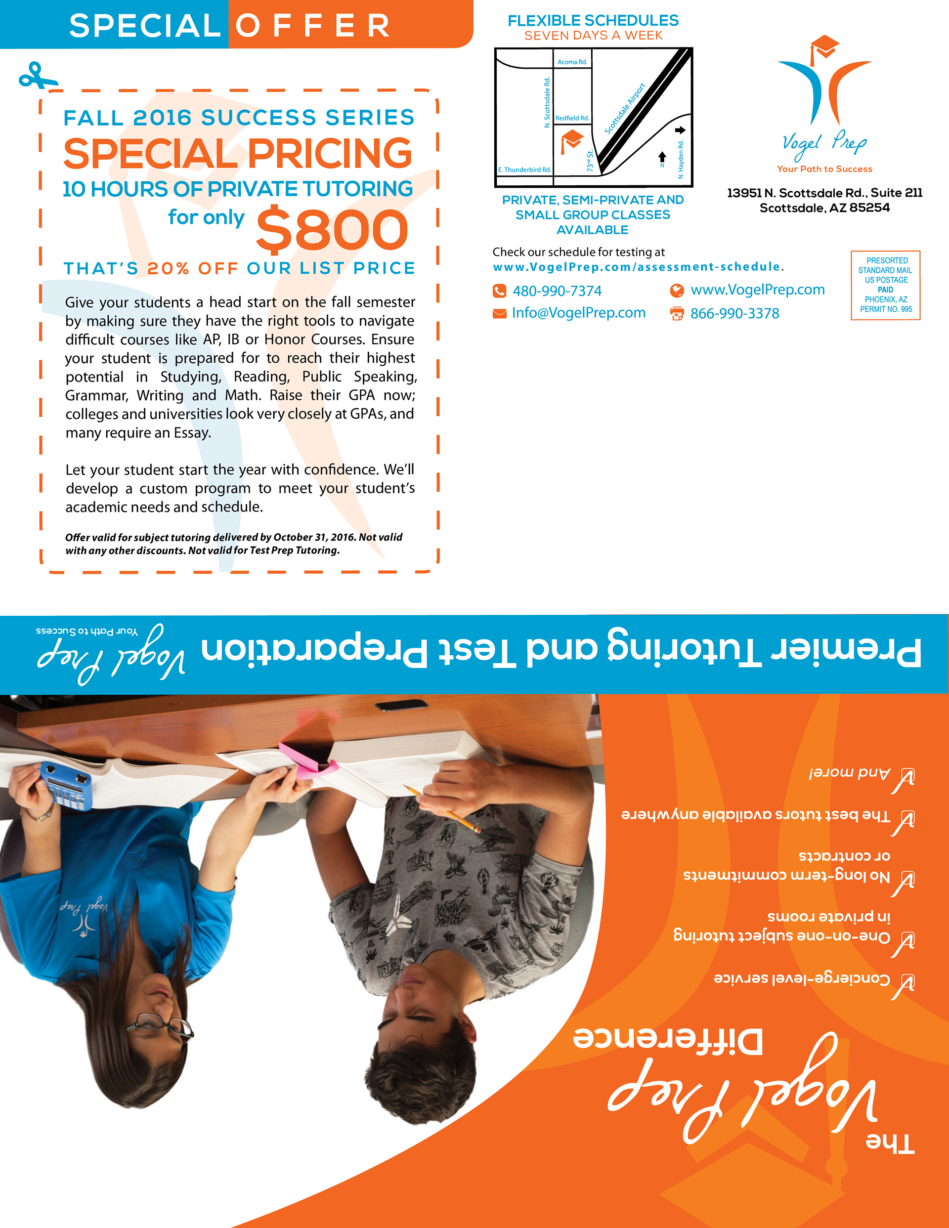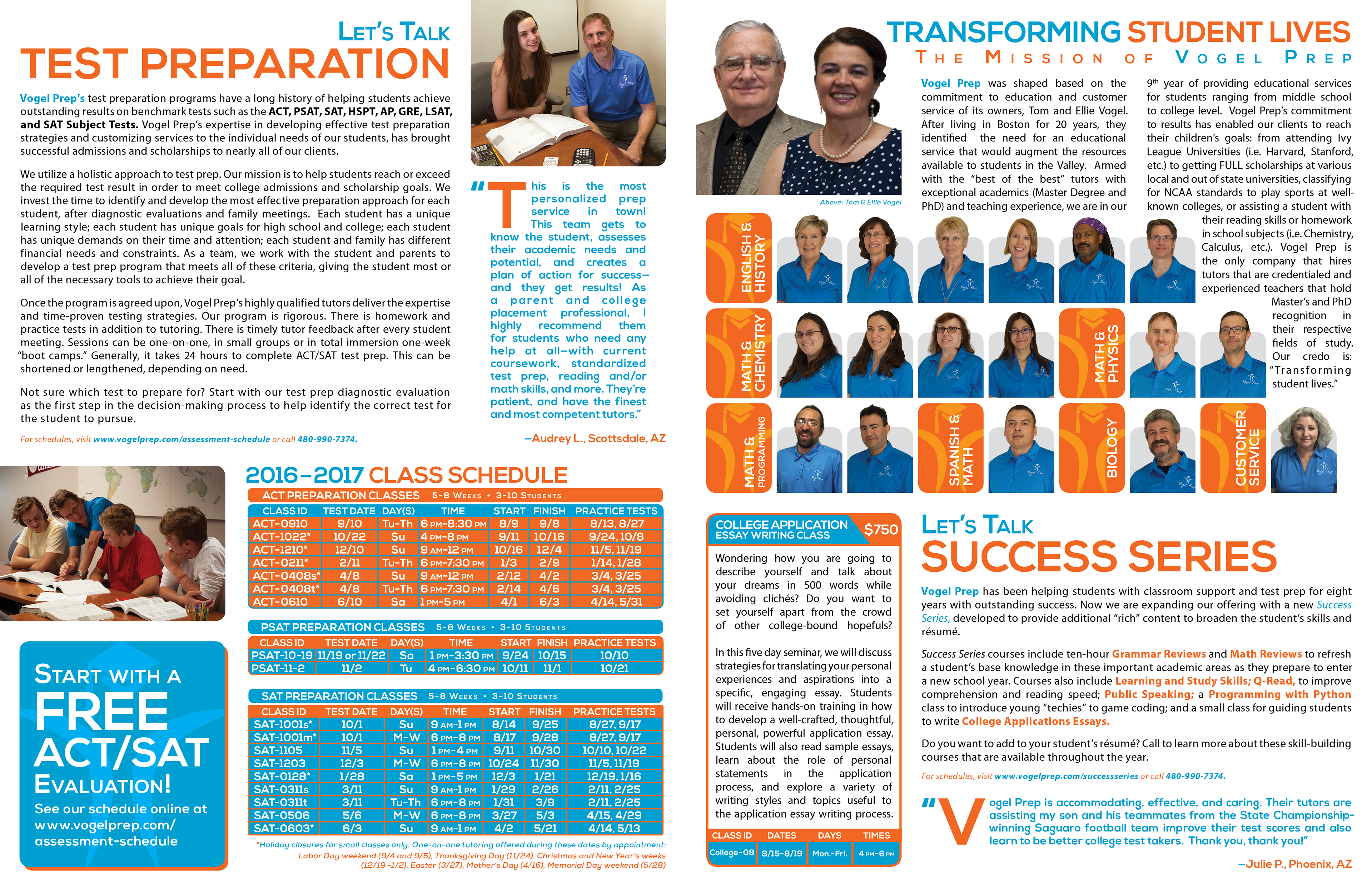 A four-page brochure promoting tutoring services for the 2016-2017 school year for Vogel Prep, a Scottsdale, AZ-based test prep firm.